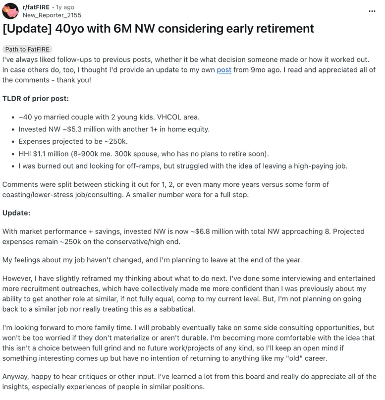 - Reddit (r/fatFIRE) — Update — 40yo with $6M NW considering early…