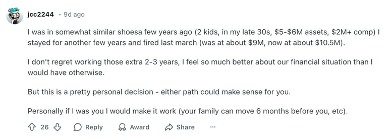 Another commenter described being in a similar position in his late 30s, with two children and total assets around S$6.7 million to S$8.1 million. His peak annual compensation exceeded S$2.7 million.