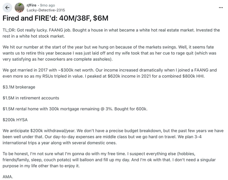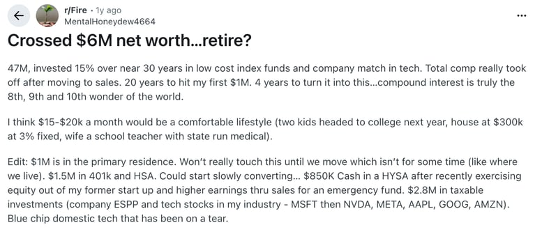 - Reddit (r/Fire) — Crossed $6M net worth/retire?